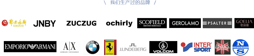 新元服裝擁有一支有著豐富經(jīng)驗(yàn)和忠于職守的專(zhuān)業(yè)團(tuán)隊(duì),以誠(chéng)信為本,嚴(yán)謹(jǐn)務(wù)實(shí),重視質(zhì)量和交期,與國(guó)內(nèi)外的多家客戶(hù)建立了長(zhǎng)期良好的合作關(guān)系,公司的服務(wù)的國(guó)內(nèi)外品牌包括: